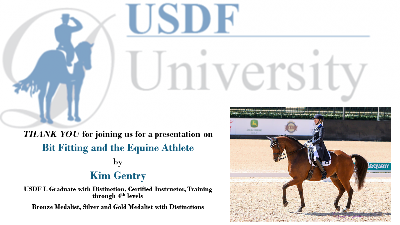 Join USDF Certified Instructor & L Gradiate Kim Gentry as she discusses the importance of proper bit fitting in our equine partners. She covers the uses for different kinds of bits, how to measure, bridle fitting and more.
